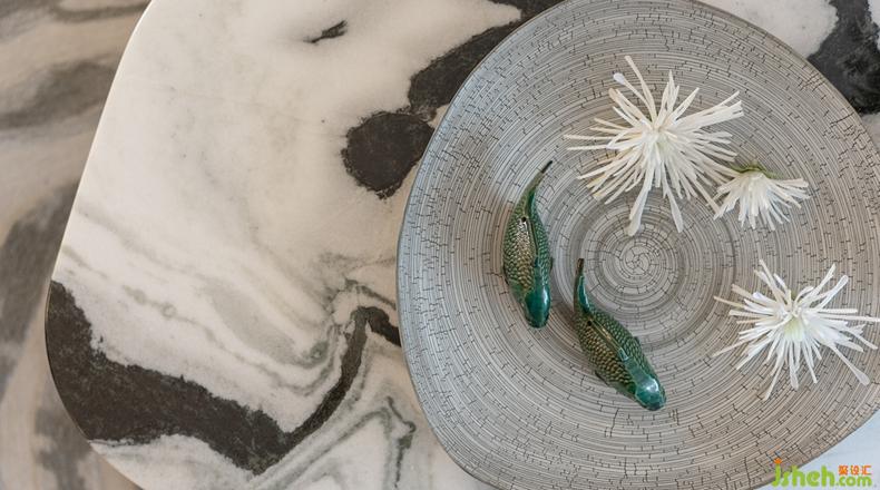 室內(nèi)設(shè)計(jì)師通過藝術(shù)的手法抒寫藝術(shù)與想象交融的意境對話,淺棕調(diào)木飾面帶著一方清冷與理性,加之中灰調(diào)背景墻、家具布藝,帶來素凈、優(yōu)雅視覺觀感,黑白灰意境大理石紋理描繪出水波蕩漾的波瀾感,東方韻味藝術(shù)品恰到好處地與客廳空間交融,崎嶇的地毯肌理,如同巖石溶洞的時(shí)間記憶,已然超乎于生活之上