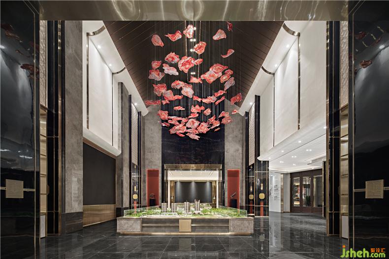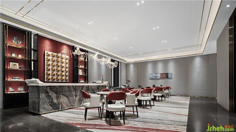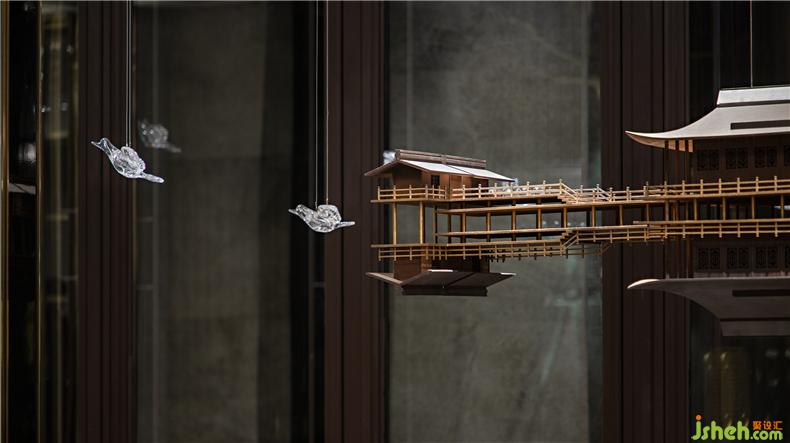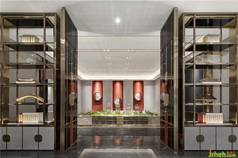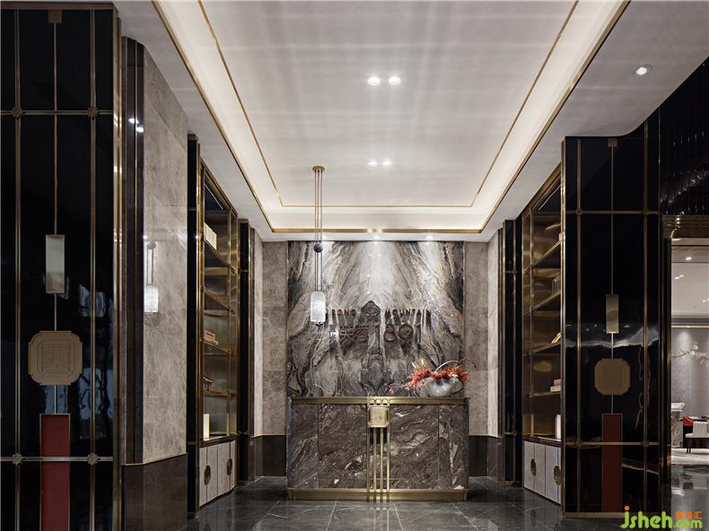 一處建筑的表現(xiàn)張力往往從公共空間開始,黑灰色調(diào)襯托著鎏金色度的優(yōu)雅,方正開闊的空間秩序鋪陳著儒雅的敘事邏輯,移步亦趨的旱景作品鋪設(shè)出古韻的藏墨畫卷,讓空間遐帶一隅夢回之境,對話中式美學(xué)的謐靜。