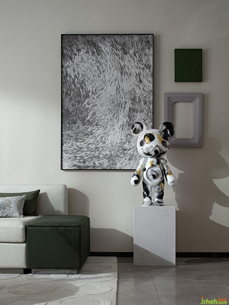 全景落地窗讓光線被最大化的保留,同時(shí)也打開了探索的視野界面,素色的布藝沙發(fā),立體的抽象掛畫,星際熊的潮流人偶,都是居者對(duì)生活熱愛的呈現(xiàn),無需繁復(fù)的色彩,即能鋪陳無限的想象,進(jìn)行一場與樂趣與熱愛對(duì)話... ...