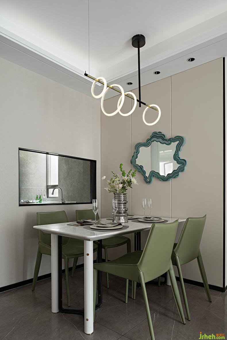 對(duì)潮流的熱愛總可以在餐廳區(qū)域有著超越時(shí)空的呈現(xiàn),創(chuàng)意十足的環(huán)裝疊加式頂燈,樣板房設(shè)計(jì)不規(guī)則的空間浮雕餐邊鏡,搭配著讓視野足夠舒適的星云綠花藝布景的桌幾,簡卓設(shè)計(jì)的餐椅讓餐廳跳脫出傳統(tǒng)的認(rèn)知,每一處細(xì)節(jié)都是作品。