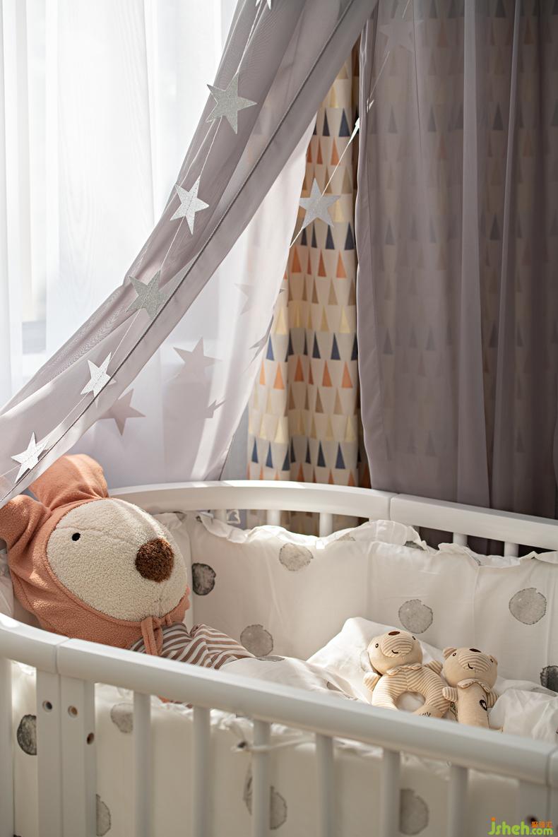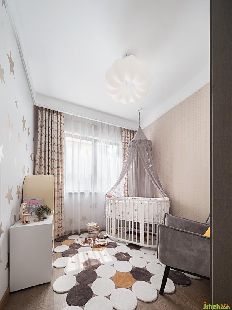 充滿童真的星體墻面,浪漫夢(mèng)幻的云狀燈飾,色彩拼接的月型絨毯,鮮活色彩的玩偶手辦,陽(yáng)光透過(guò)窗幾映射在搖籃床的一刻,是足以讓空間定格宇宙時(shí)空的浩瀚,每一處都是伴隨成長(zhǎng)的魅力所在。