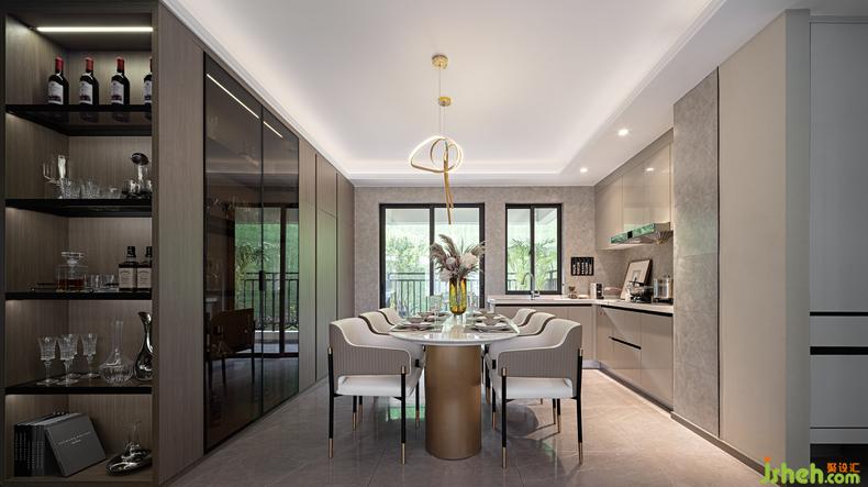 視野轉(zhuǎn)角到餐廳區(qū)域,雙動(dòng)線的設(shè)計(jì)在這一隅開(kāi)闊的空間中顯得游刃有余,創(chuàng)意頂燈、金屬色調(diào)、幾何圖形,樣板房設(shè)計(jì)藝術(shù)裝置在這個(gè)屬于美味的世界里更多些奢華的氣息,在南北通透的光影之下,品味一場(chǎng)極具儀式感的私享宴遇。