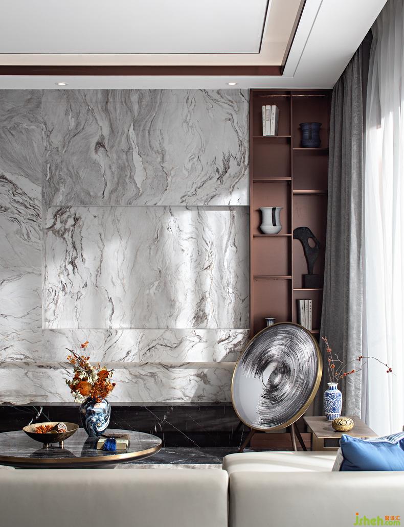 從餐廳看向客廳丨長型空間加強(qiáng)了深邃的縱深感,大理石面如同遠(yuǎn)山畫作,樣板房設(shè)計(jì)尤顯靈動雅致,利用水墨元素定制的藝術(shù)音響,給予現(xiàn)代標(biāo)簽化之外的東方氣質(zhì)。