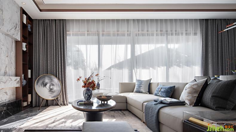 客廳細(xì)節(jié)丨溫潤的墨色、清透的紗簾、飽滿的陽光,樣板房設(shè)計(jì)空間氣質(zhì)在強(qiáng)烈與雅致間自由切換,新與舊在這里自然融合而不相斥,呈現(xiàn)出空間與物體共處的和諧美感。