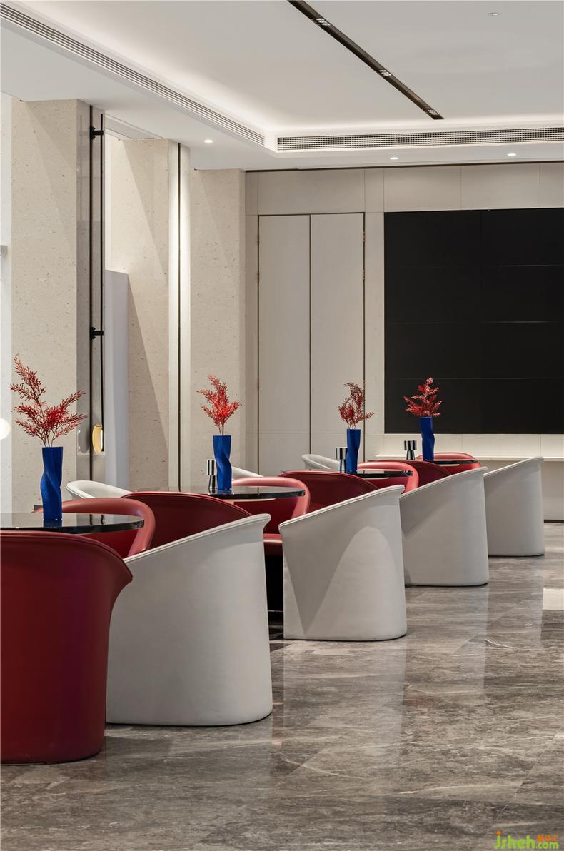 洽談區(qū)細(xì)節(jié)丨克萊因藍(lán)和波爾多酒紅的互補點綴,相互映襯、裝修設(shè)計突顯并烘托藝術(shù)的極端“外向”性,同時又不乏時尚的敏銳和跳脫。