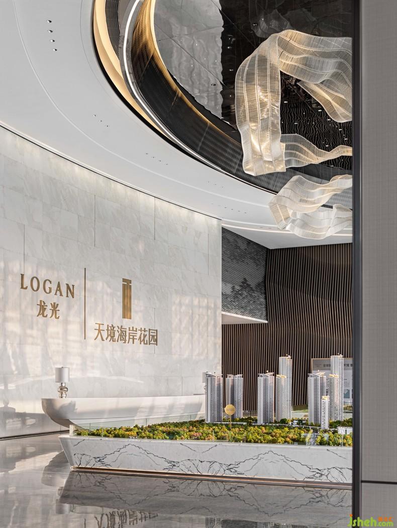 接待前廳丨開闊大氣的圓形布局一展新式奢華,金屬、大理石、花崗巖自帶厚重華貴質(zhì)感、乳白、米白、金屬自由色與自然植物映照山海天境,一切與水清沙白,蔥郁繁茂的海岸風(fēng)光融會貫通,處處透露著尊享精致的沉靜之感。室內(nèi)設(shè)計師