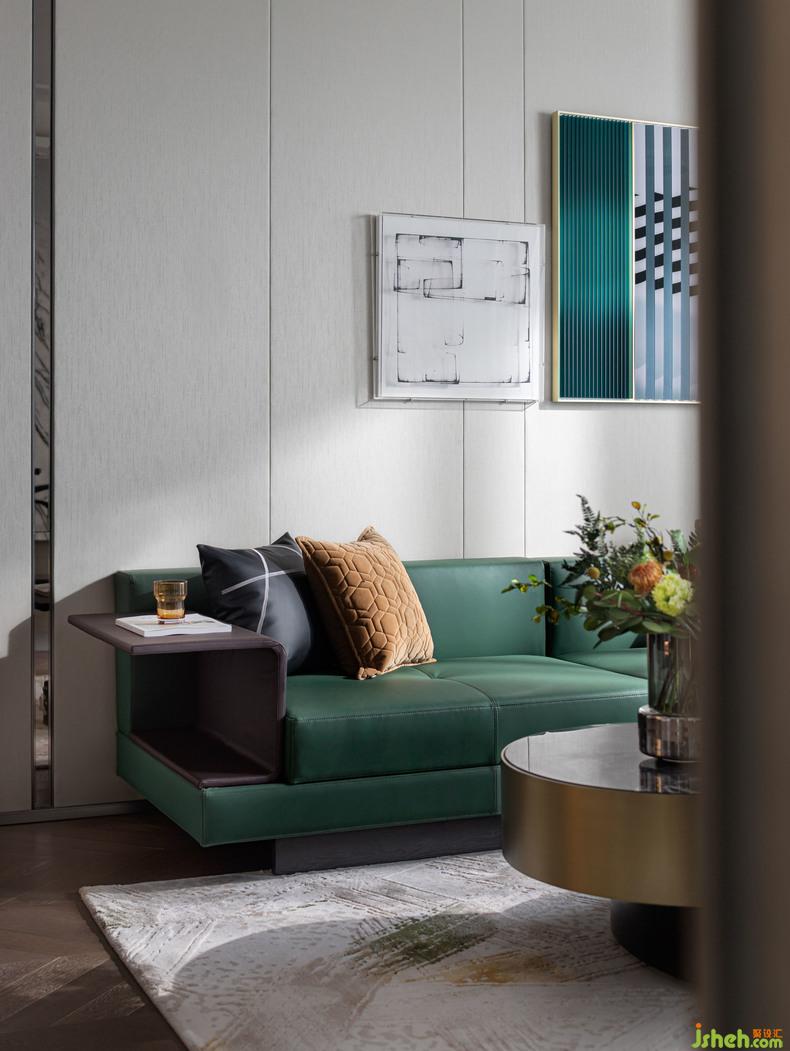 客廳丨熱情與冷淡,硬朗與溫柔,率性與謹(jǐn)慎.....室內(nèi)設(shè)計(jì)師在不斷地平衡與取舍中混搭出“家”的趣味性。大膽的墨綠色皮質(zhì)沙發(fā)賦予空間時(shí)尚又復(fù)古的氣息,金色和奢橘的調(diào)和出精致感受,現(xiàn)代的燈具與裝置,給你一個(gè)宅在家的理由。