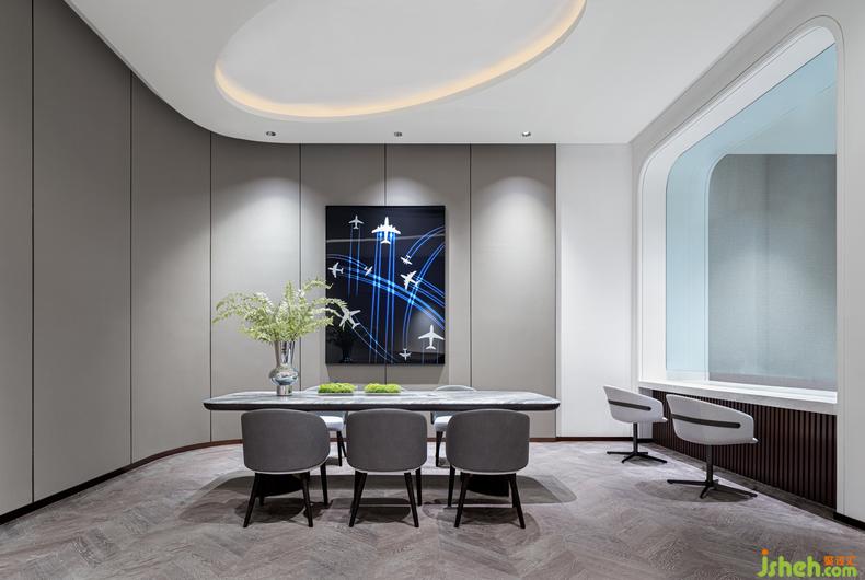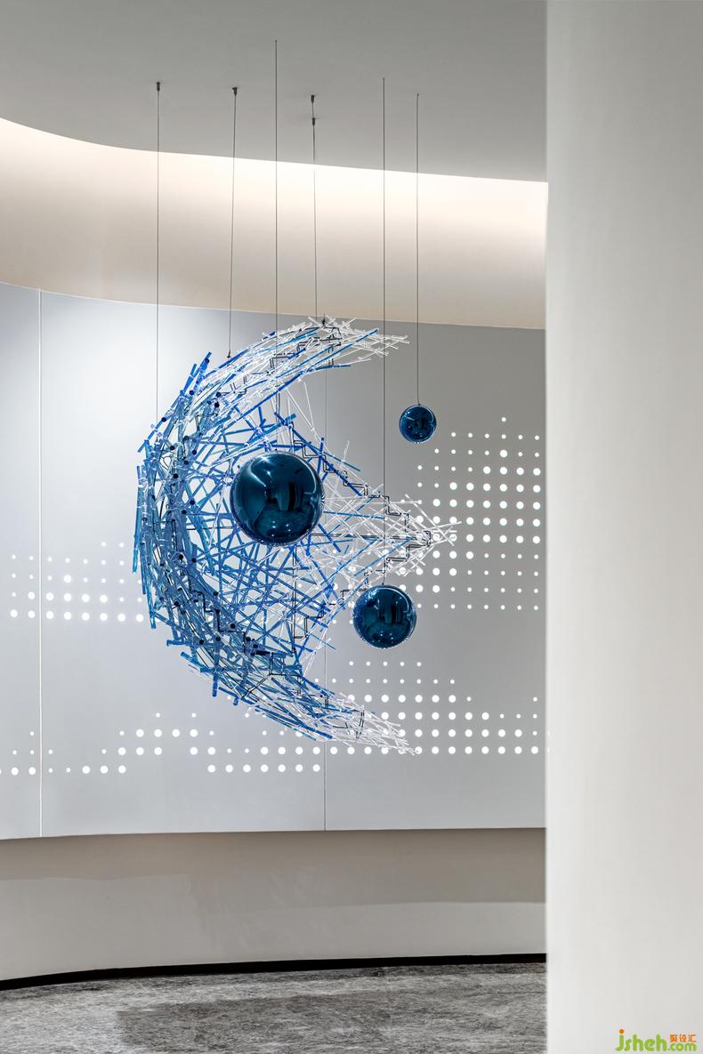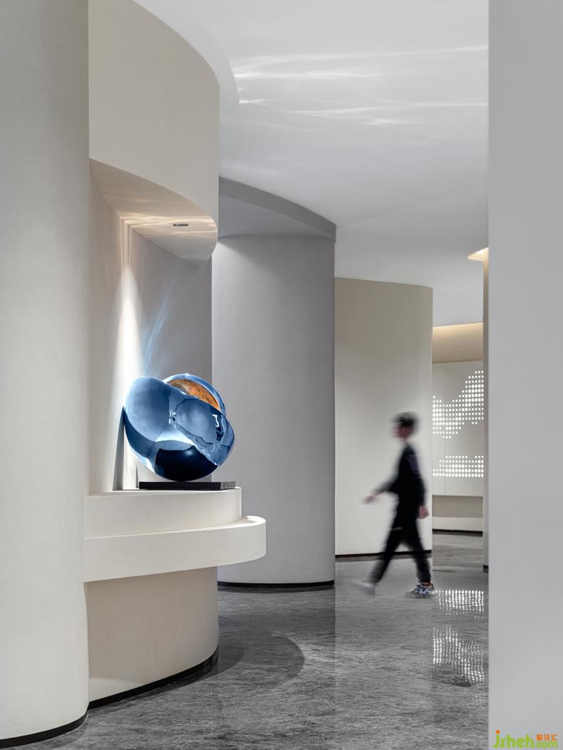 走廊丨 動線的流通總是可以成為契機(jī),來激發(fā)更多能量的釋放,室內(nèi)設(shè)計師一處流線波紋的創(chuàng)意靈感,透過視野的角度呈現(xiàn)自由的變幻,自身的蔚藍(lán)的光影配合光源的反射,讓體驗更加豐富、真實和多元。