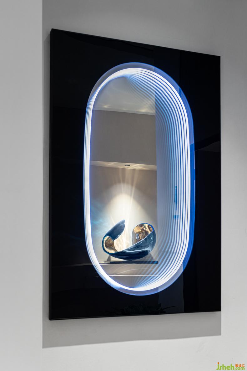 裝置丨 如聲波、如星跡的自然起源與再現(xiàn)的的形態(tài)裝置,如同能量的嵌入,室內(nèi)設(shè)計師將未來的動態(tài)體驗滲透在視覺軌跡之中,用光影的結(jié)合構(gòu)建光速的快與慢、溫柔和動感,穿透它的視野,更如一副直擊心靈的作品,演繹著科幻世界的“光與空間”。
