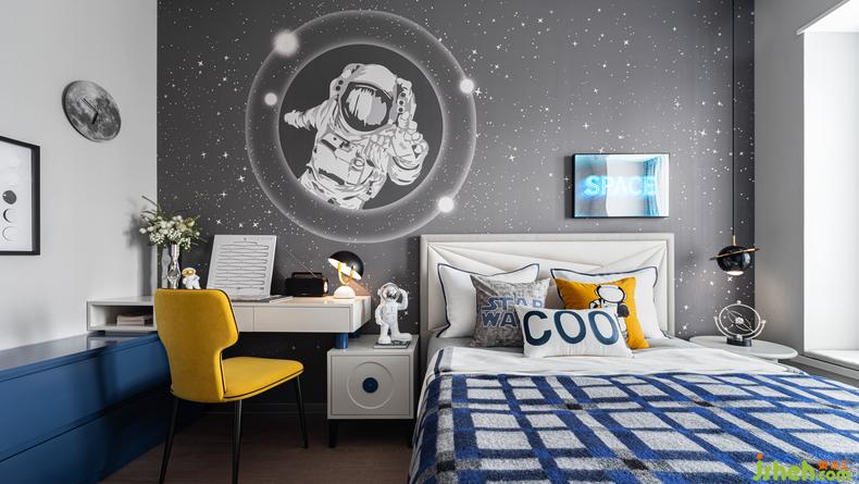 兒童房用多維的元素傳遞情感,標(biāo)注性的藍(lán)色氣息讓孩子的成長(zhǎng)充滿未來氣息,宇航員的墻體視覺更讓孩子熱愛得以肆意延續(xù),配以童趣設(shè)計(jì)感十足的物品裝飾,讓空間不僅有愛更充滿活力。