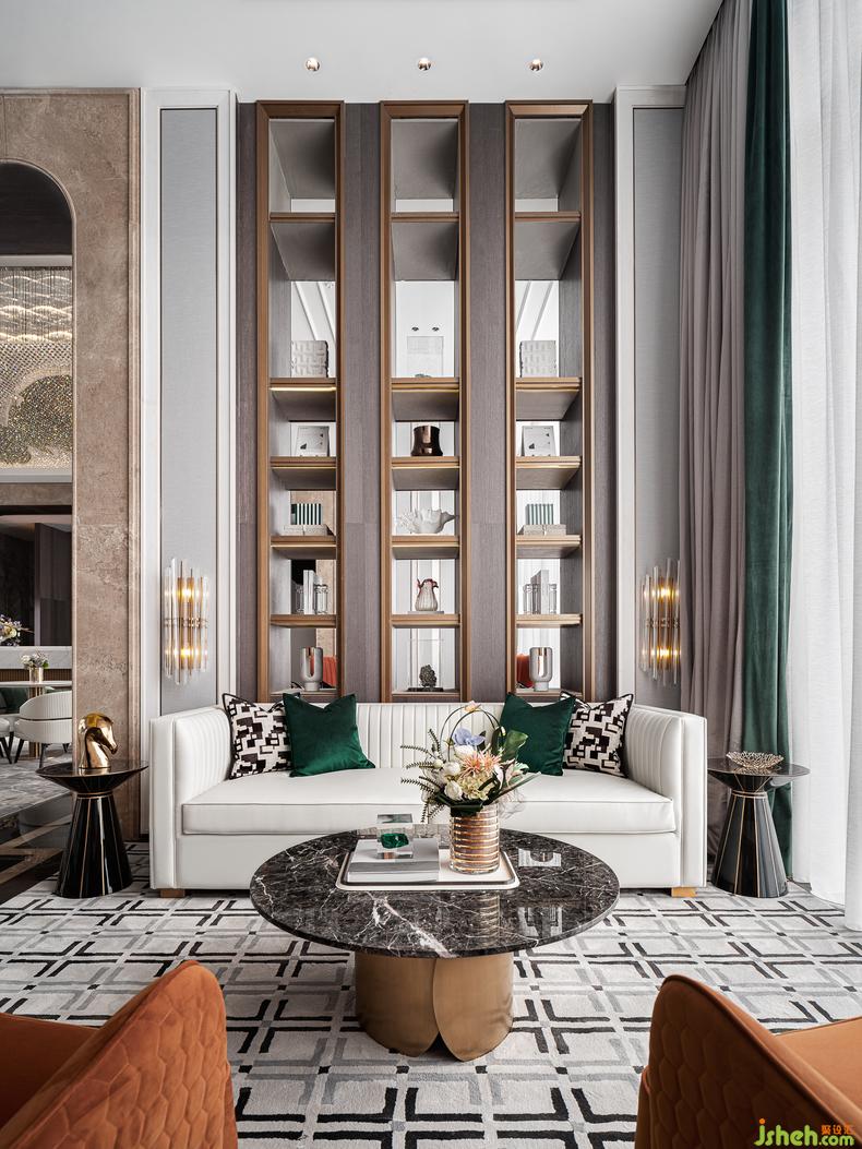 中廳洽談區(qū)丨 不刻意挑戰(zhàn)前衛(wèi)創(chuàng)新,也不流于趨勢隨風(fēng)擺動,室內(nèi)設(shè)計師開闊明敞的理性訴求架構(gòu)規(guī)整,而色彩則為其注入了感性的脈絡(luò),猶如珠寶洽談區(qū)的溝通方式,半圍合的形式給予洽談序列,縱橫對稱的審美語言讓空間敘事精致典雅。