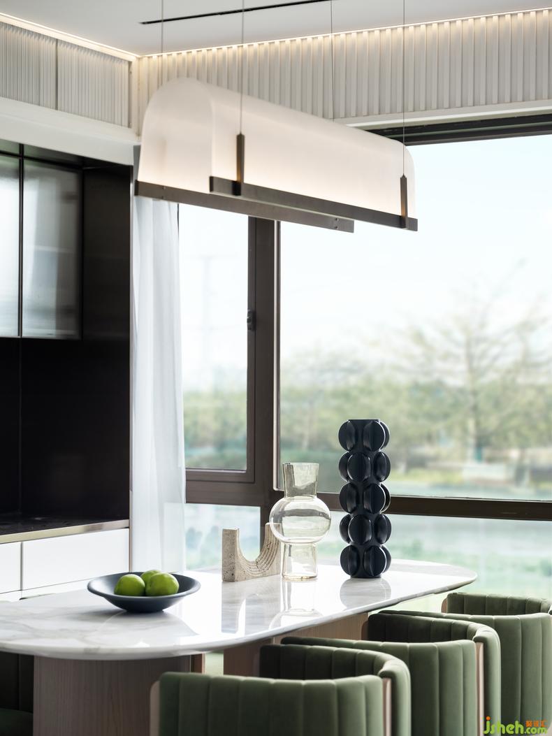 餐廳的布局方正且通透,墨綠與浮白的色彩配比從客廳延續(xù)開來,樣板房設(shè)計營造出視覺沖擊,石材與木質(zhì)的餐景裝飾呼應(yīng)著落地光影映射下的蔥郁綠植,將自然融入空間,讓時光藏著愜意。