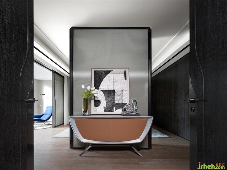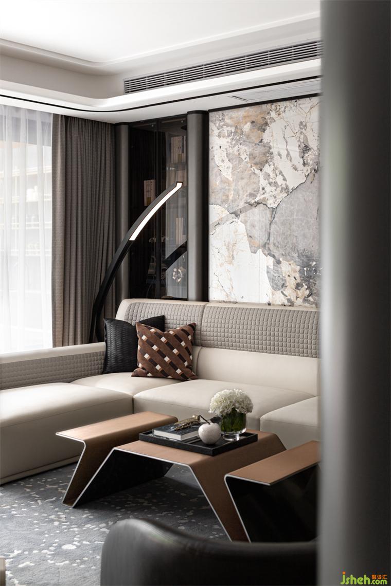 客廳丨高級(jí)的灰調(diào)與橙色相遇,冷靜與熱情碰撞,低調(diào)與張揚(yáng)對(duì)接,樣板房設(shè)計(jì)積蓄的力量剎那迸發(fā)驚爆了感官,空間的開合,色彩的解構(gòu),簡(jiǎn)潔的線條,別致的家具組合,在不同的狀態(tài)和光線下充滿不同的趣味與變化。