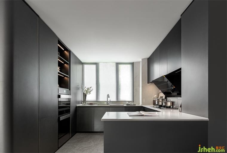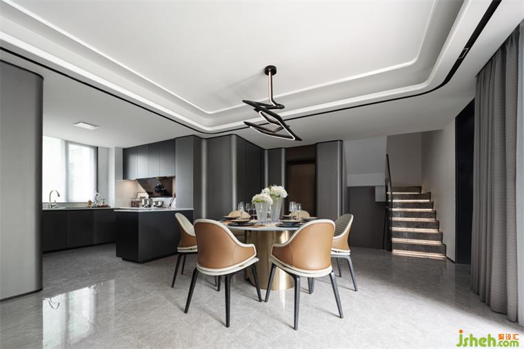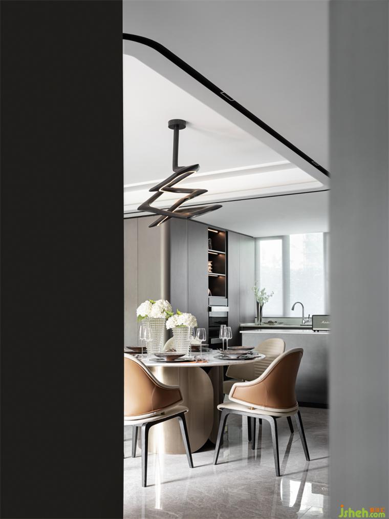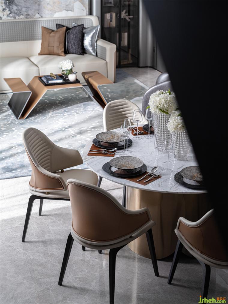 餐廳丨U型半開放式的廚房將餐廚島臺(tái)融合到設(shè)計(jì)里,極大地利用空間,樣板房設(shè)計(jì)圓形餐桌能容納多人圍坐餐食,聚攏人氣,給予濃烈的生活氣息;精致的餐具組合增添空間的質(zhì)感,在品味餐食的同時(shí)也在品味美好生活。