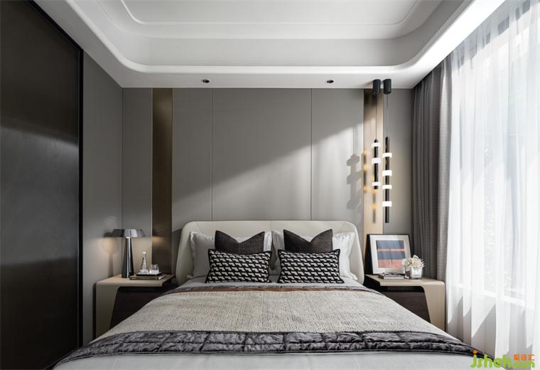 客臥丨延續(xù)低調大氣的調性,以暖白調的皮革鋪陳輕奢質感,輔以菱格紋、時尚燈具、植物與藝術品的組合來彰顯生活品味與態(tài)度,讓居住者在柔軟中放松,在雅致里愜意。