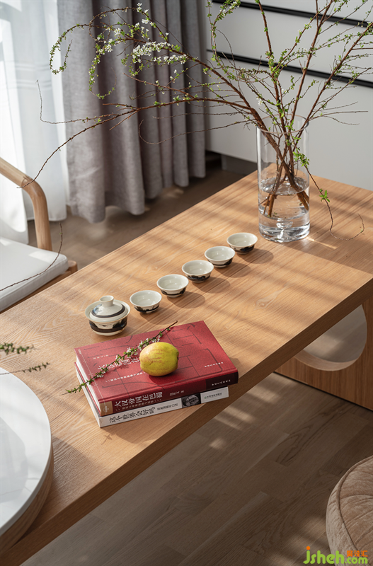 原木色的桌椅與同色系蒲團(tuán),客廳空間的會客功能并未被淡化,而是以返璞歸真的形式予以釋放。