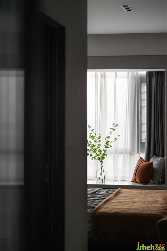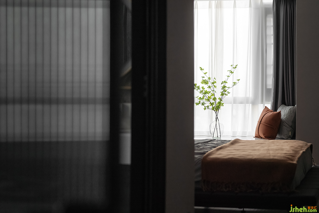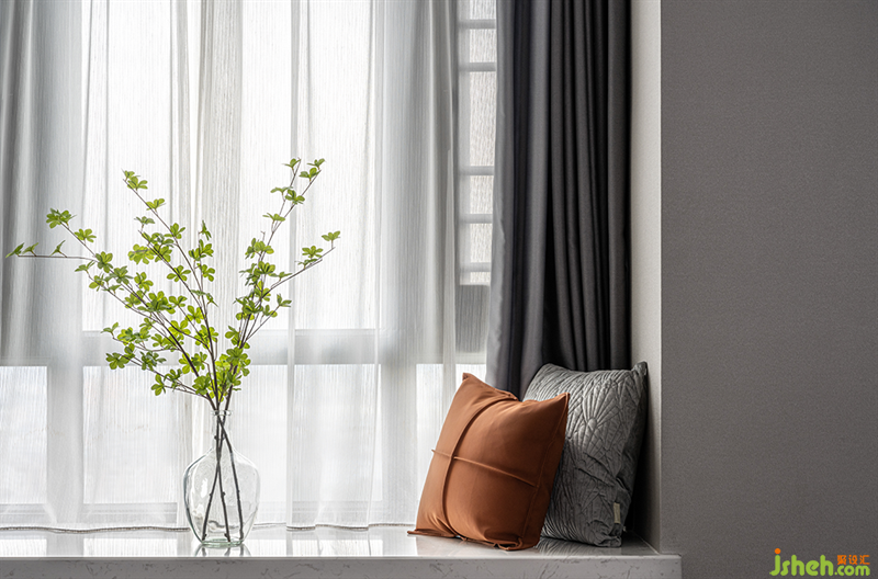 窗臺(tái)的處理兼顧了晾曬和閱讀的功能性。墻面鋪貼飾面板與墻布,寬窄相間的比例線條讓空間有律動(dòng)的節(jié)奏感。