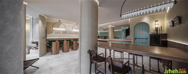 荒漠綠洲最難覓,轉角茉香更沁人。入口處沒有撲面而來的蔥蔥郁郁,反而將微水泥的原始質(zhì)感延伸到室內(nèi),餐廳設計粗糲的墻面既像是工業(yè)文明遺跡,又像古老的羊皮卷,將室內(nèi)外的設計鋪陳協(xié)調(diào)一體,打造端景的同時,又與原木裝飾呼應,營造出斑駁的荒蕪感。