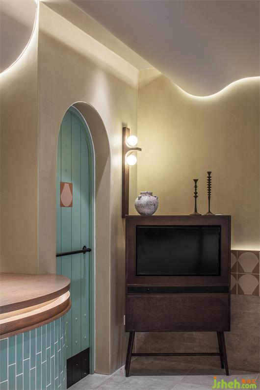 經(jīng)營(yíng)區(qū)的柜臺(tái)及墻面以強(qiáng)烈的建筑感與序列感打破沉悶,共同承載起情感氛圍的營(yíng)造。餐廳設(shè)計(jì)多種元素的銜接調(diào)和,在色彩與幾何元素的融匯碰撞中,構(gòu)筑利落清爽格調(diào),又極具時(shí)尚氣息。拱形門(mén)與圓弧圍欄的組合正像水分豐沛的沙漠植物,有秩的線性肌理搭配淺綠色的通篇布局,于盎然生機(jī)中呈現(xiàn)出虛實(shí)交替的美學(xué)意境。