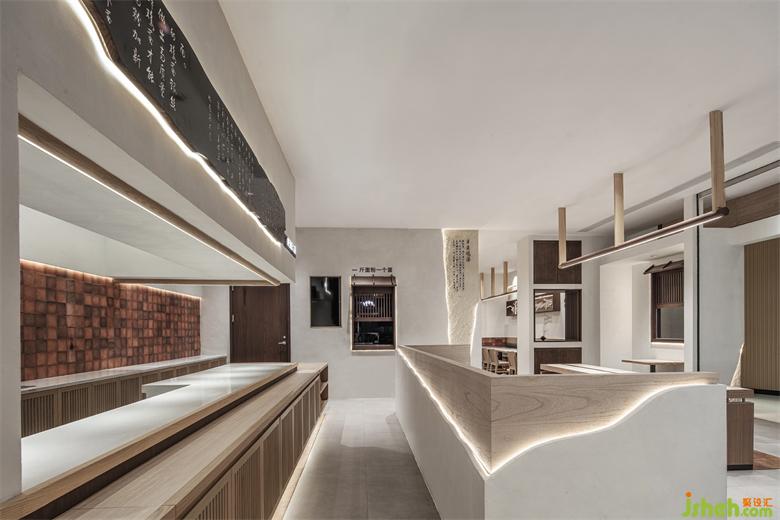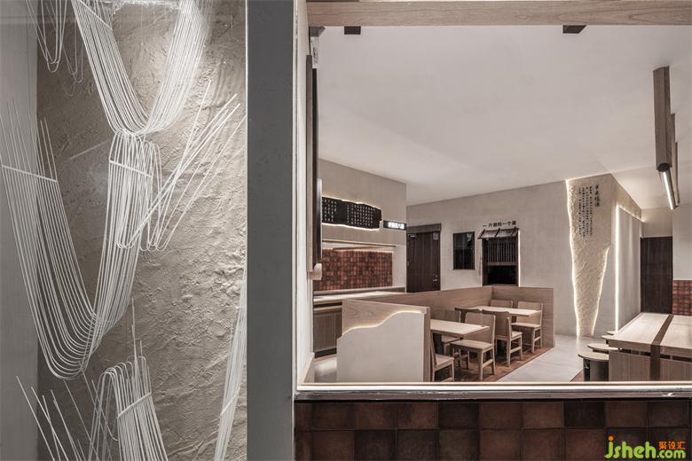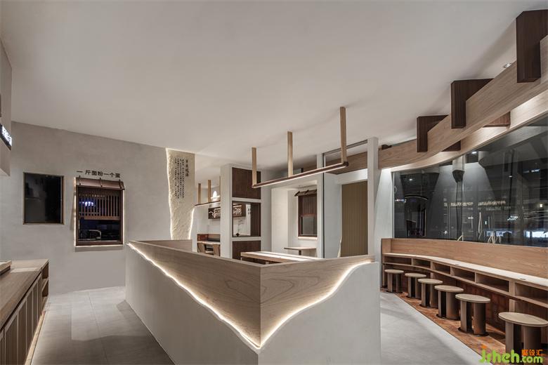 The door header is simplified, and the Suzhou style architectural elements are introduced in modern ways. Wood and brick, geometric shape and arc are interspersed and superimposed to blur the spatial boundary and create an immersive sensory experience with virtual and real crisscross. The mottled walls are supplemented by the decorative effect of lights to add a touch of delicacy beyond time and space into the rough appearance, giving people a warm style full of liife, making the whole restaurant independent of the complex and diverse environment of the mall and forming a unique visual focus.