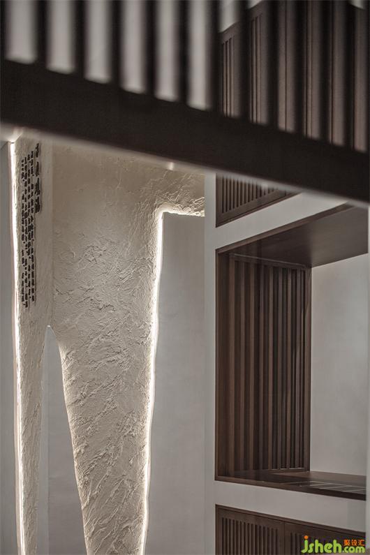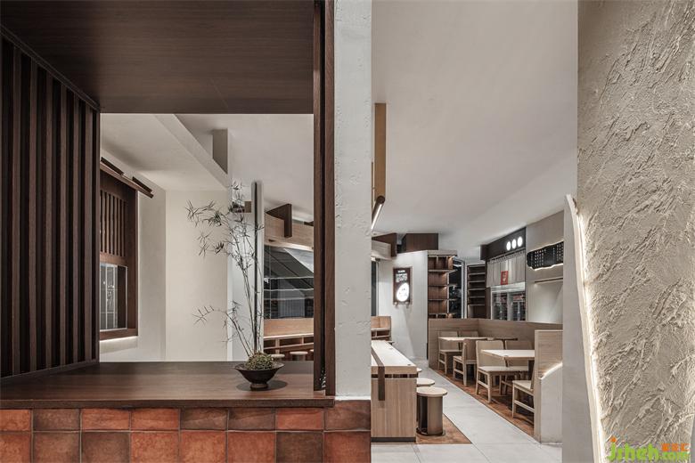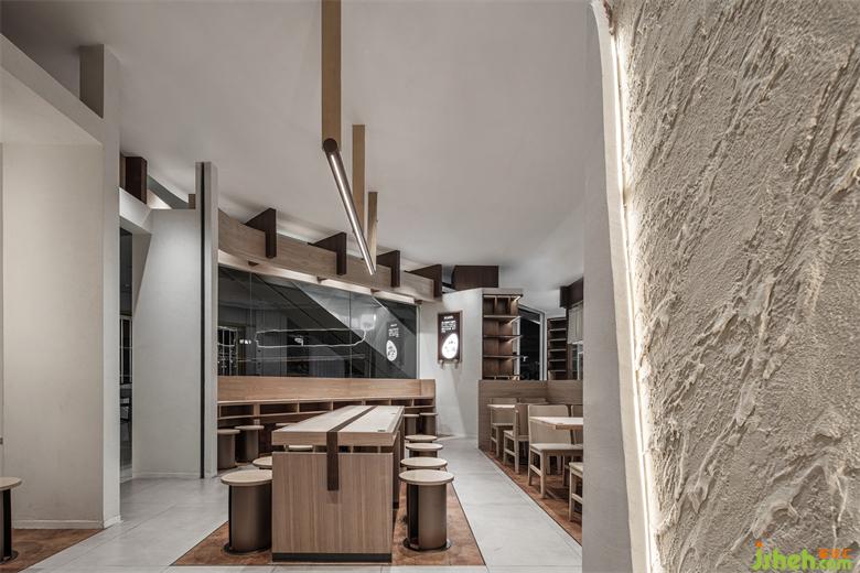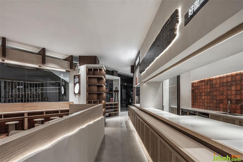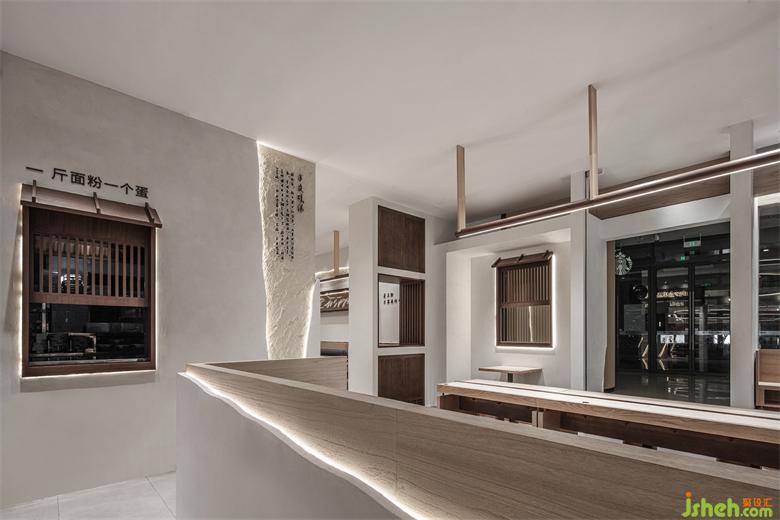 推門(mén)深入,室內(nèi)延續(xù)東方美學(xué)雅致澹然的筆觸,鮮明的品牌記憶,亦濃縮于其中。面館設(shè)計(jì)大范圍的木質(zhì)包裹,氤氳出溫潤(rùn)質(zhì)樸的自然氣息,奠定了清新素雅的空間基調(diào)。紅磚白墻透過(guò)粗獷的紋理與質(zhì)感,實(shí)現(xiàn)復(fù)古與新生的平衡表達(dá),以回應(yīng)品牌一以貫之的歷史底蘊(yùn)與文化內(nèi)涵。燈光與墻邊體塊、線(xiàn)條造型的交織,也讓整個(gè)空間萌生更加豐富的層次。