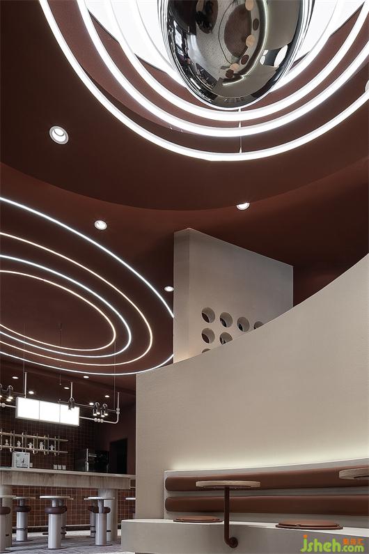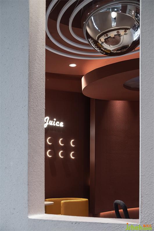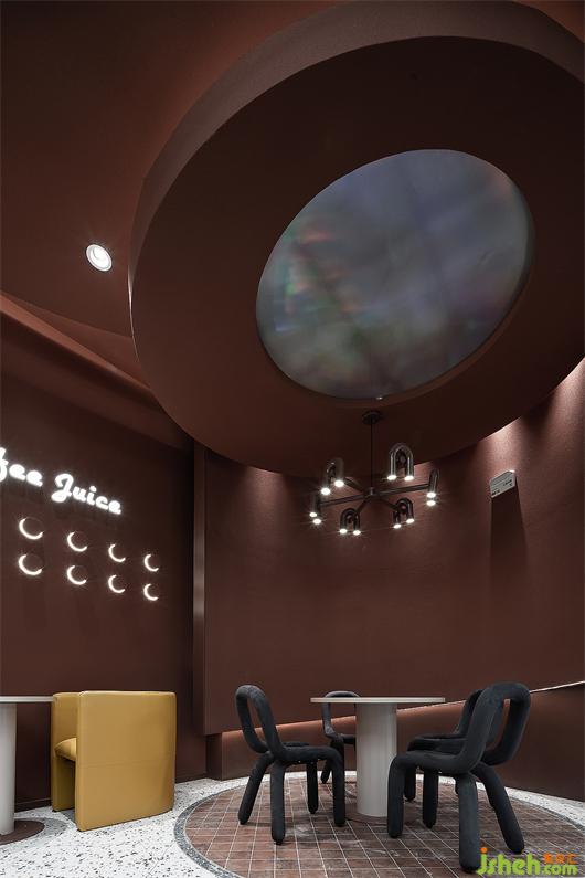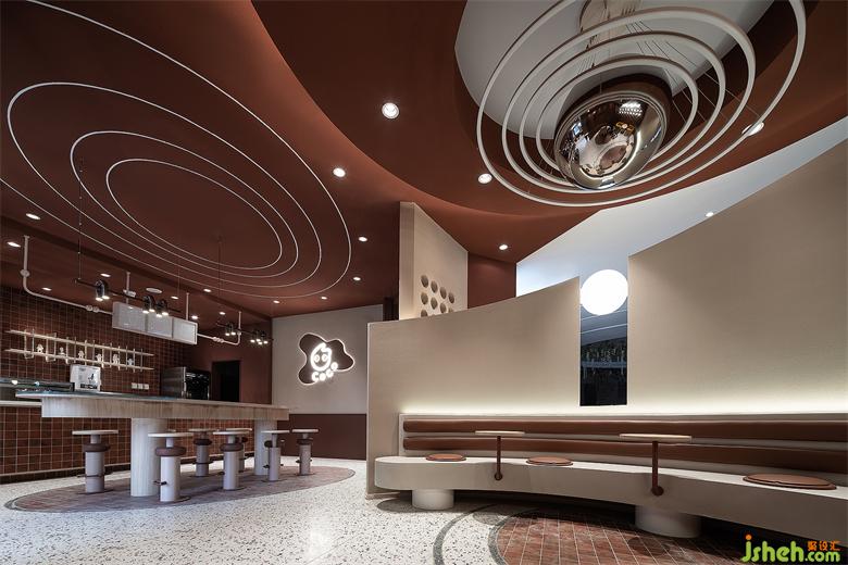 門頭造型呼應(yīng)飛船著陸的概念,奶茶店設(shè)計運用自然與物象的肌理,組合成新的趣味性視覺語言。外墻面刷成焦糖色,宛如高原上的“紅土壤”,有著來自原始的包容性。大小不一的球形燈散落在粗糲且質(zhì)樸的隕石壁上,營造出強(qiáng)烈的視覺沖擊感,引導(dǎo)來往的行人去探尋、發(fā)現(xiàn)和感知。
