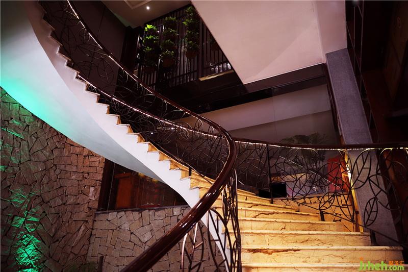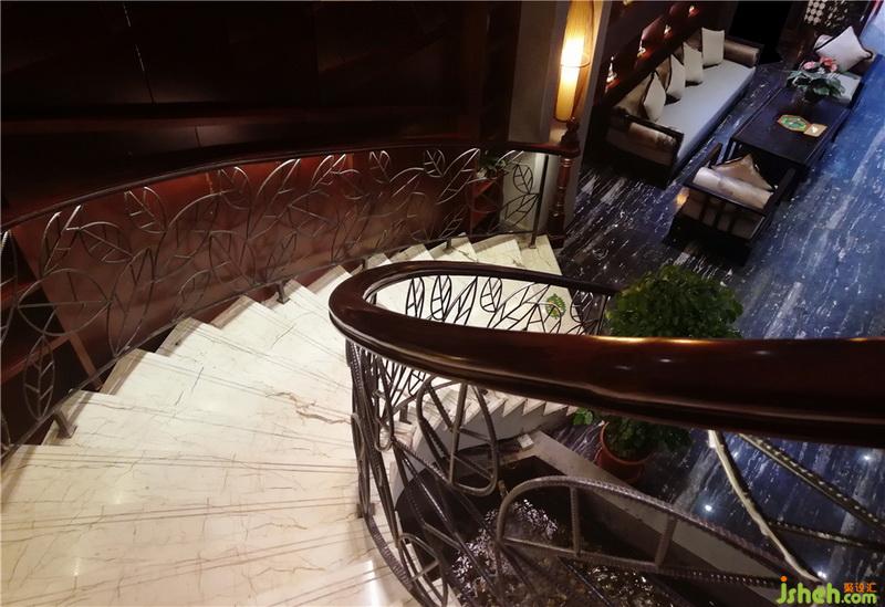 生態(tài)線條旋轉(zhuǎn)樓梯、斧鑿石、蘑菇石、火山石、麻石、魚池、魚缸、腐木、山水畫、草編紙、森林草原秋景、鋼筋焊制樹葉圖形扶手、平頂無吊燈的大堂……還有你佛陀。