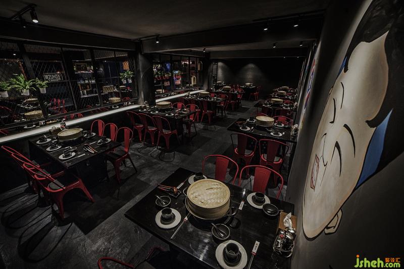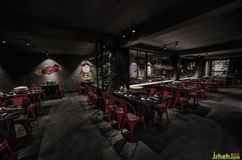 重色調(diào)的大環(huán)境,不但工業(yè)味和酷感十足,還是為了突出餐廳設(shè)計軟裝的精彩。紅色和藍(lán)色是朝鮮民族的代表顏色,因此我們在軟裝設(shè)計上選擇了大量紅色的鐵椅子作為空間的焦點(diǎn)。紅色具有刺激食欲的作用,紅與黑也是既經(jīng)典又具有視覺沖擊力的搭配。獨(dú)立設(shè)計的卡通元素墻繪,呼應(yīng)主題,顏色豐富,不僅點(diǎn)亮了空間,更令原本的酷感中增添了一份童趣。