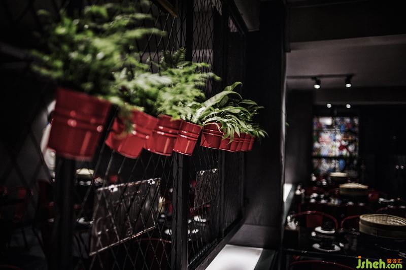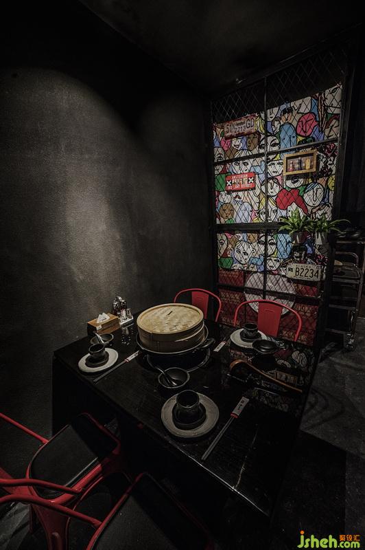 黑色的墻壁,深灰色的天花與地面,如此的重色調(diào)能減少燈光的漫反射,使射燈燈光都集中在餐桌、墻繪、墻飾等精彩之處,戲劇化的燈光效果也讓人視線更有聚焦的重點(diǎn)。