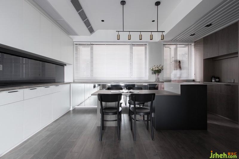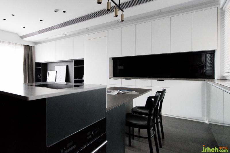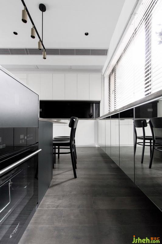 餐廳有著寬闊靈動的環(huán)形動線。中島臺設置了烤箱和電磁爐,方便女業(yè)主進行簡單的煮食和制作糕點,這無形中也延伸了廚房的區(qū)域。墻面上,從靠近玄關并與其呼應的深色木面柜體、到窗戶下明亮的鏡面柜體、再到與電視墻一體成形的白色柜體,三者提供了非常充足的收納空間,各自的材質使用分工明確而又能自然地過渡。