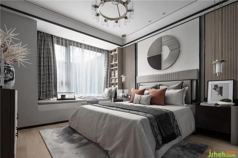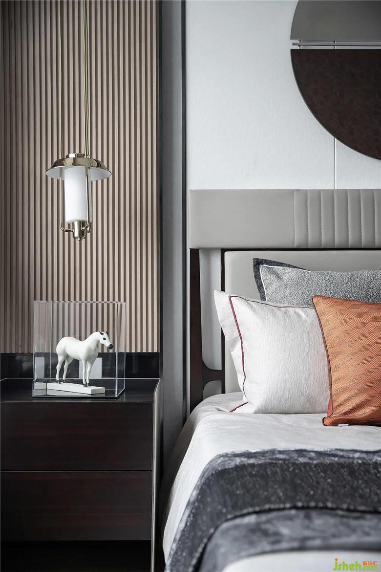樣板房設計虛掩的紗幔、雅致的燈飾,架構出空間的形與影、光與色?;野卓臻g里局部微微點綴些明艷色彩,空間的詩意美學暈暈開來。