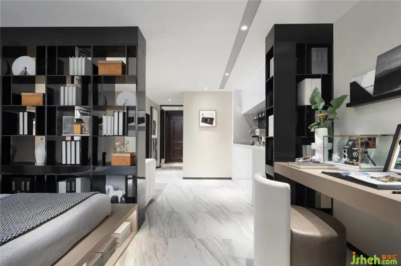 我們以不同尋常的構(gòu)思樣板房設(shè)計(jì),讓書架在空間的作用被賦予多重意義。它不僅是閱讀、自修的場(chǎng)所,亦是讓客廳、臥室形成一種融合下的獨(dú)立個(gè)體。在為各空間帶來(lái)隱私性的同時(shí),也不乏對(duì)空間尺度的把握。