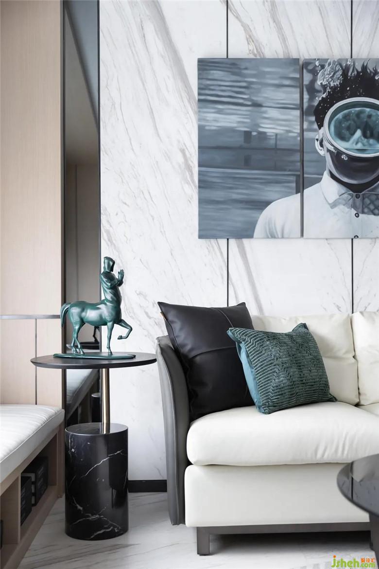 美學是一種籠統(tǒng)的范圍,但生活的模樣卻可以具象到一個抱枕、一本書,或一件織品。休憩空間使用簡約內(nèi)斂的色調(diào)使人沉淀心靈,藝術掛畫的穿插,配以舒適溫柔的床品,愜意中又不失生活意趣的氛圍。