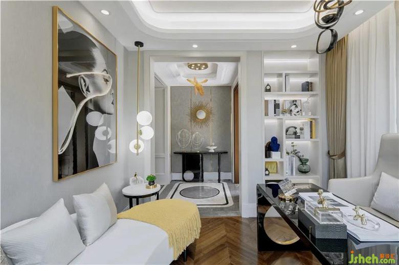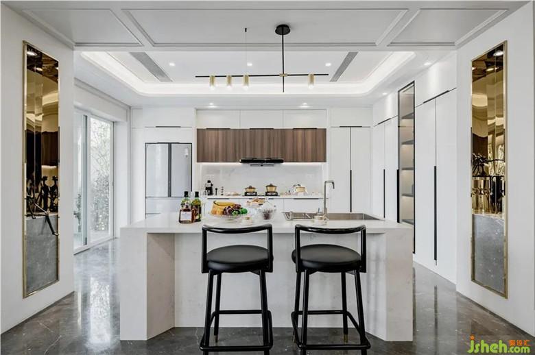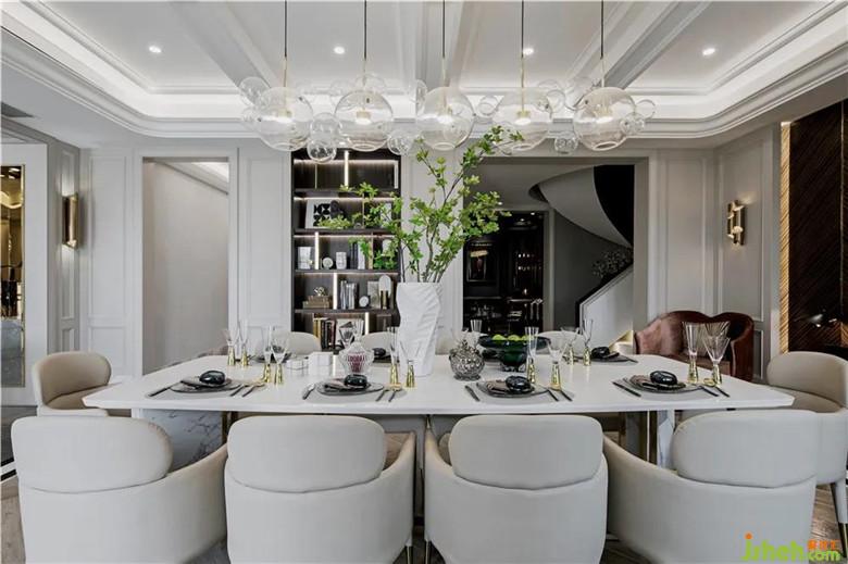 茶室在滿足冥想、品茗的同時也可作為接待、聚會的多重屬性。空間享有最好的采光面,高挑的結構使空間更為寬敞、高貴,大理石圍合的壁爐形式刻印現代美式的柔和、溫暖感,頂面配以流性燈飾,落而不俗。