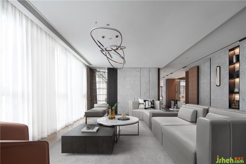 軟式搭配淺色調(diào)皮質(zhì)沙發(fā),塑造空間溫潤的基底,視角凝看天幕,曼妙的流性燈飾流露些許溫情,圍坐于次,從喧囂塵世中抽身片刻,感受靜謐,休憩身心。