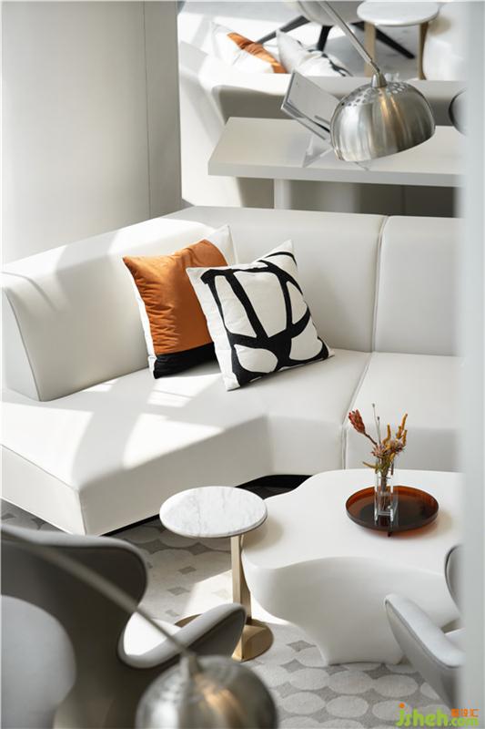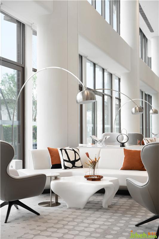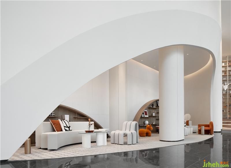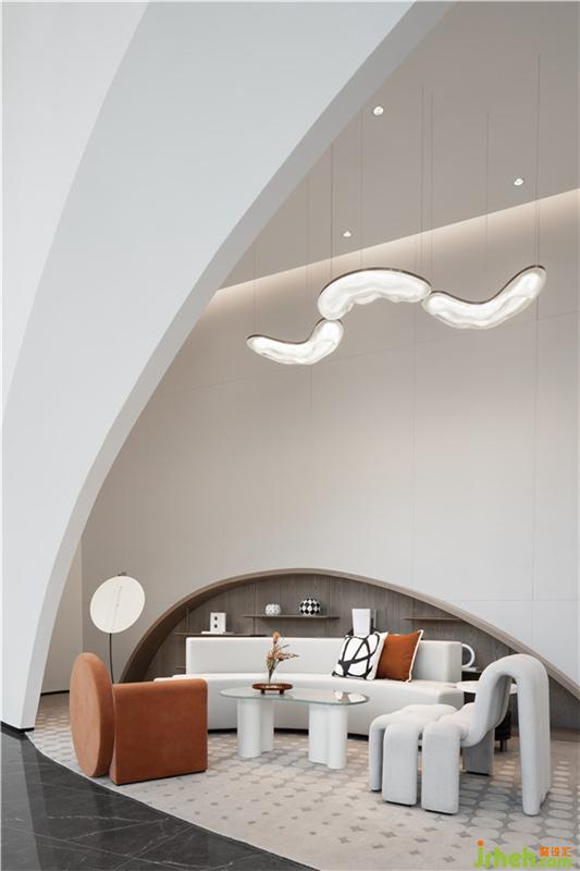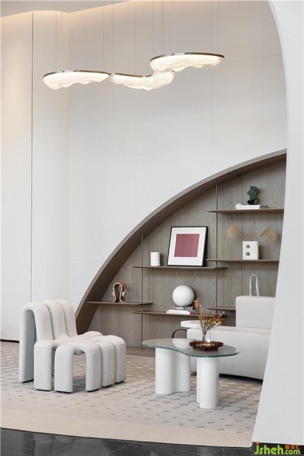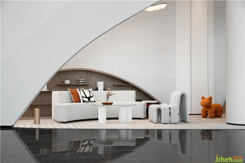 步入洽談區(qū),人們直面的是動(dòng)線明朗的休閑閱讀、洽談品茗區(qū)域?,F(xiàn)代簡約而精細(xì)的美學(xué)搭配,隨著立柱與弧線曲度流動(dòng),形成別具一格的交互體驗(yàn)空間,純凈色彩加以大面積挑空,架梁起繁華都市上的一隅清閑之地,濾盡浮華,內(nèi)心一派舒朗。