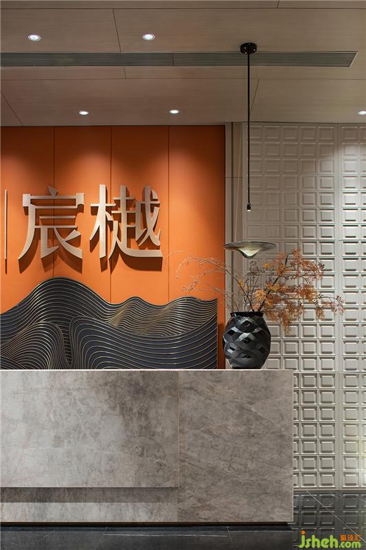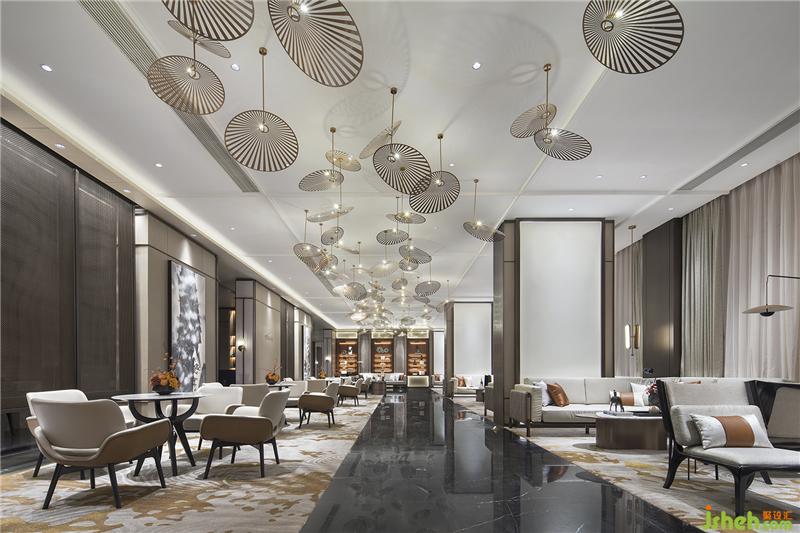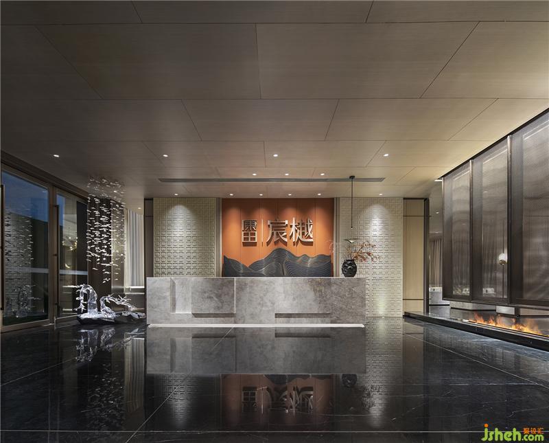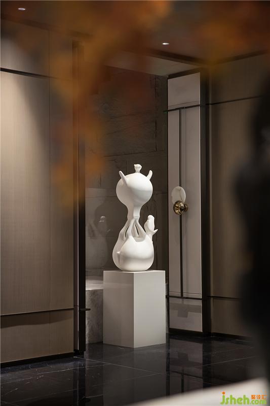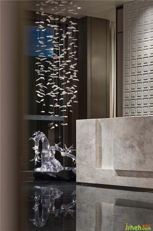 接待廳在濃郁的深境中辟出一絲輕盈之氣,星星點點的藝術裝置如礁石擲入江低,激起層層漣漪,飄飄然般的朦朧感模糊了室內外的界限。