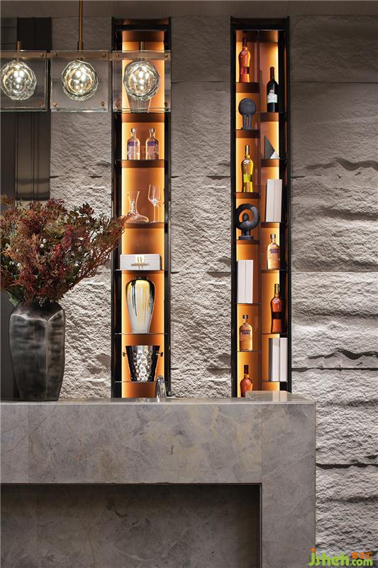 光線從不銹鋼鏤空隔斷滲入水吧區(qū),形成似透非透的格局。水吧區(qū)域,運用木、石、金屬等材質,銷售中心設計使氛圍產(chǎn)生質的變化,簡約下不乏幽靜慵懶之感。