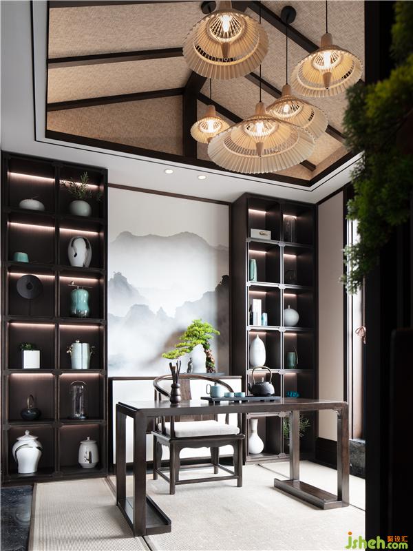 硬裝布局以非常精確的比例關(guān)系來描繪生活態(tài)度至上,開放式餐廳與茶席,也瞬間拉近了心理上的距離,傳統(tǒng)的中式餐桌椅,搭配飽含東方韻味的圓形水墨畫,以及棉麻的桌墊與盆景茶具,人文墨客推杯換盞的隱居生活畫面,悠然而愜意!