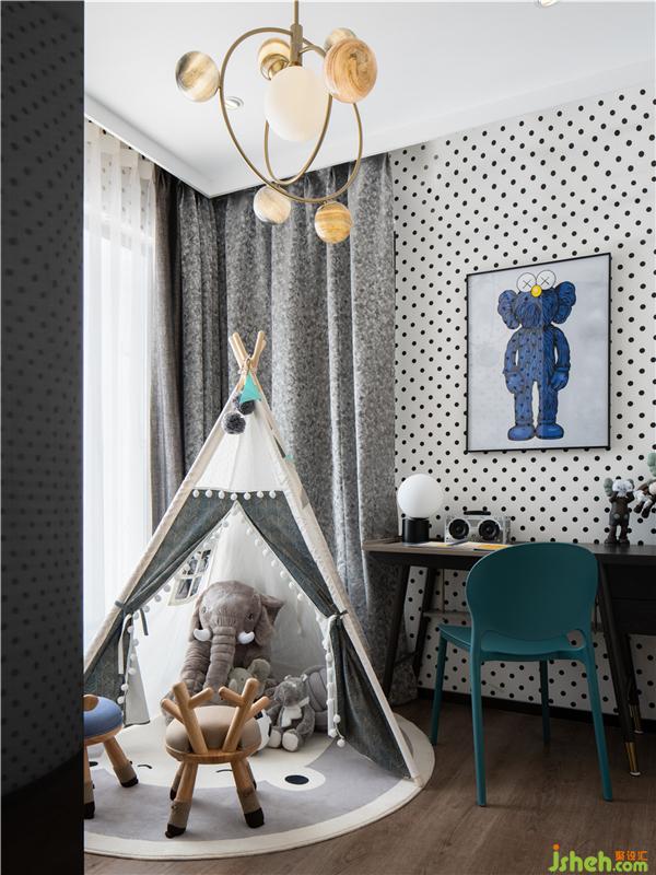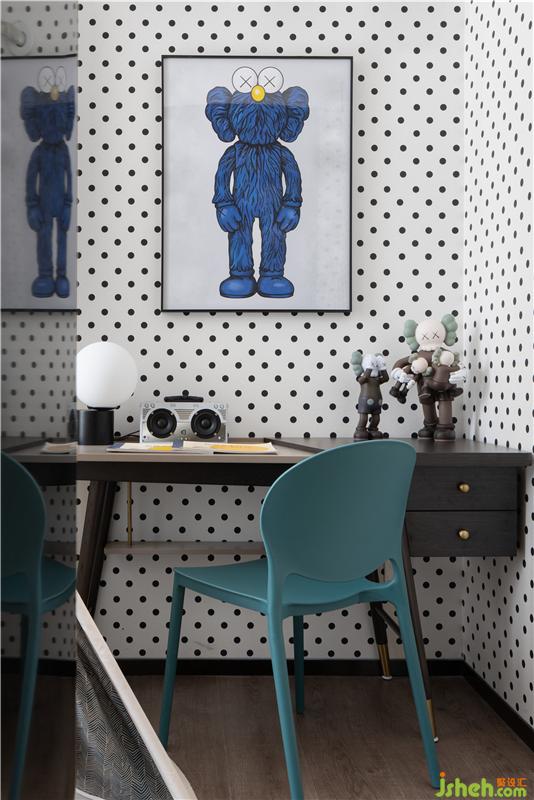 兒童房以KAWS公仔彰顯孩子獨(dú)特的個(gè)性,從墻面掛畫到桌上飾品,以明亮色彩渲染炫酷而不失童真的空間氛圍。