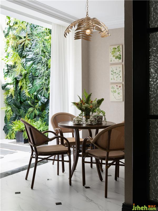 炎炎夏日,室外綠樹如蓋,知了喧天,室內(nèi)溫情敝屣。下沉式庭院并無其他物體填充,做減法的設(shè)計(jì)在滿足功能的同時(shí)兼具視線所及的美感,單一套座椅,便能滿足居住者休閑的需求。