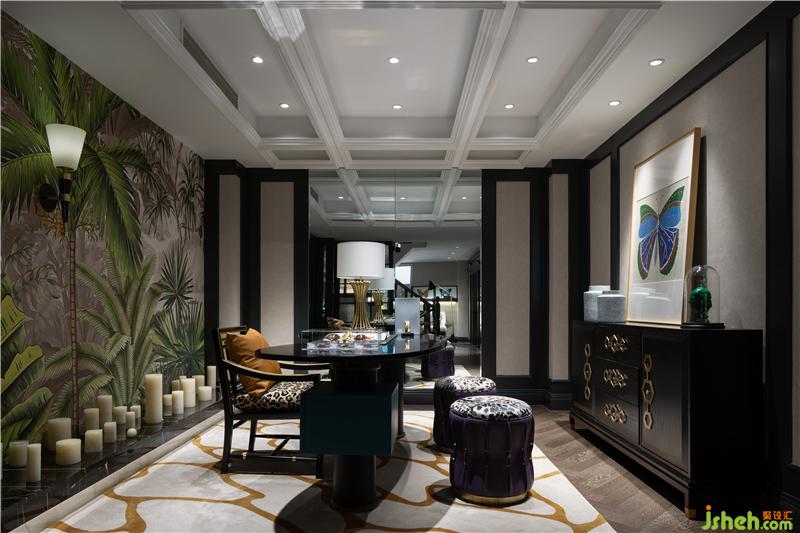 溢美之詞繼這處氣質(zhì)空間溢出,墻面裝飾植物背景,自然與空間的美感融合一體,近景遠(yuǎn)景都有美的存在。沉穩(wěn)深藍(lán)與高級(jí)黑搭配,演繹衣帽間專屬優(yōu)雅,點(diǎn)綴的金屬跳躍在空間中,增添一絲時(shí)尚與輕奢。