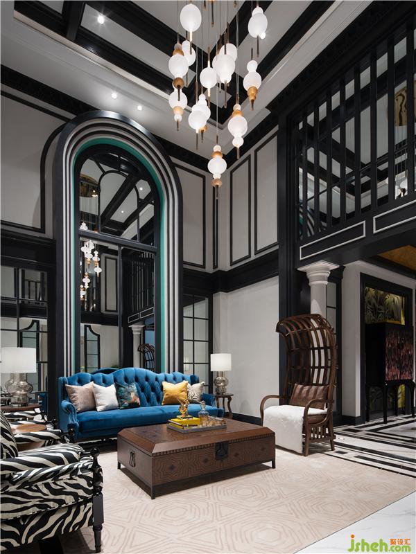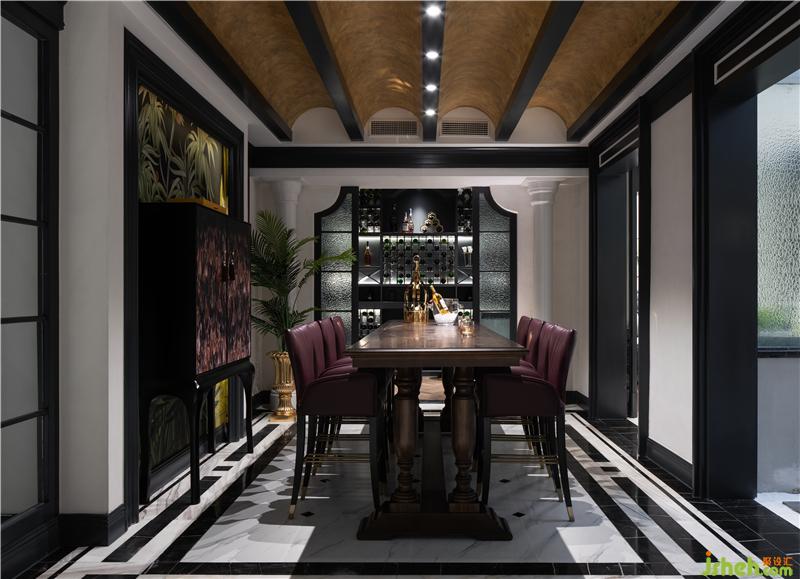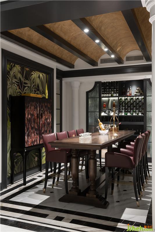 進入party區(qū),超挑高法式拱門勾勒大廳的敞闊感,空間恰到好處的線條點綴,產(chǎn)生新與舊的對話。休閑區(qū)實用性必不可少,party區(qū)一側細致地安排了酒吧區(qū)及酒窖,大面積的黑色搭配,為空間投下一道重彩。