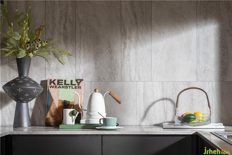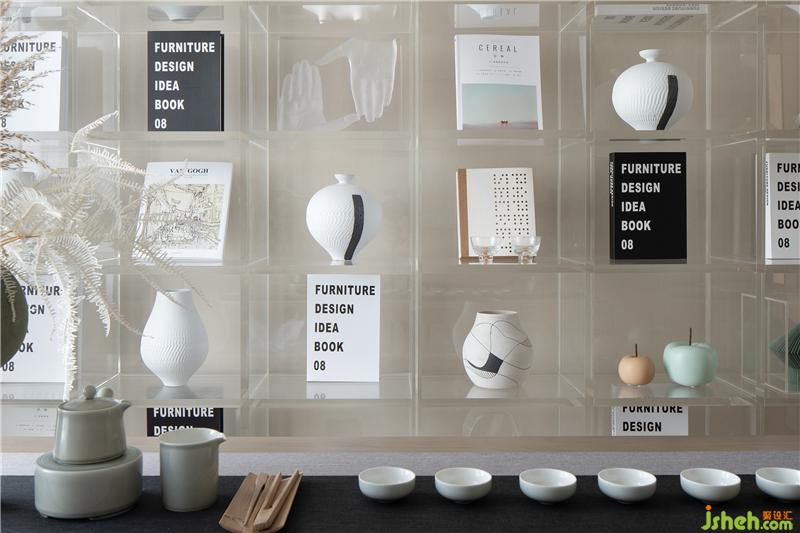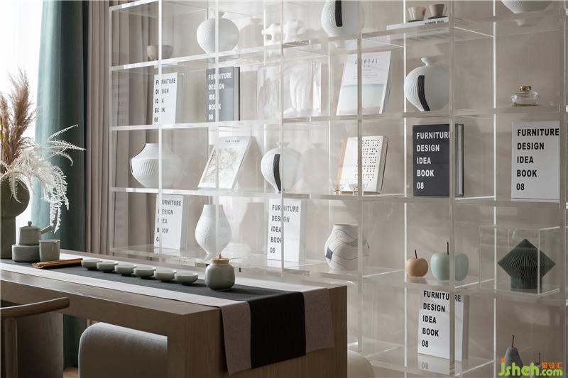 這里還陳列著主人愛好的抽象藝術(shù)畫作,調(diào)皮的小貓、連續(xù)的水平線條理性而優(yōu)雅,具有強(qiáng)烈的秩序感。入戶右邊的茶室,充滿了儀式感,樣板間軟裝設(shè)計透明的置物架在陽光下散發(fā)著熠熠的小光芒,那些看似平凡尋常的小器物擺放在一起,給觀看者提供了喚醒給予世界另種解釋可能性的機(jī)會。同時,空間又可根據(jù)使用者,功能變化,可以是直播工作間,客房,書房,花房等等承載生活。
