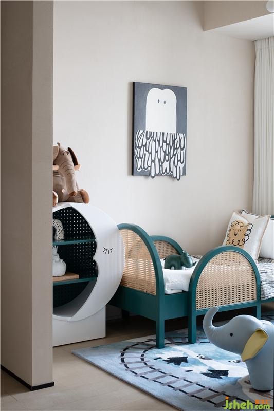 為營造自由、靈動的成長空間,不限制兒童的活動和想象力,樣板間軟裝設(shè)計以叢林冒險為主題,可愛的兒童床與玩偶來豐富空間的藝術(shù)性與趣味性,落地式月亮收納柜,一切都盡可能地靠近兒童身份特征與天性。