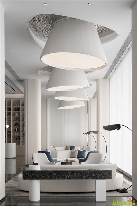 洽談區(qū)以對稱的構造交互、流動的空間內外部關系,以及水波紋不銹鋼吊頂來反射光的紋路,來加深場地本身給予人通達五感的多樣體驗,并以此形成了空間內部的敘事邏輯。