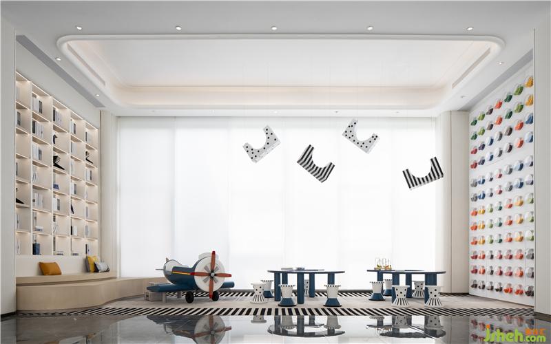 兒童區(qū)的懸浮積木裝置別出心裁,呼應可互動的樂高積木,再基于審美與藝術中的內省體驗、直覺感情的發(fā)散表達,梳理出整齊劃一的氛圍,臨窗一側,整面落地的玻璃窗,消除了室內外的邊界限制,在此交換感知。