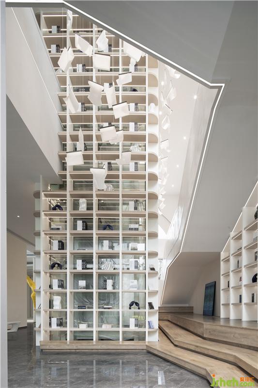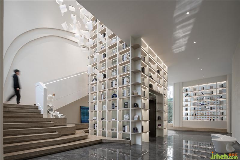 轉角的通天書架搭配書頁形狀的燈飾,在自然質感的空間中相互呼應又彼此消化,以一種精神性的致敬,共同成為空間無限“延伸”的力量來源。