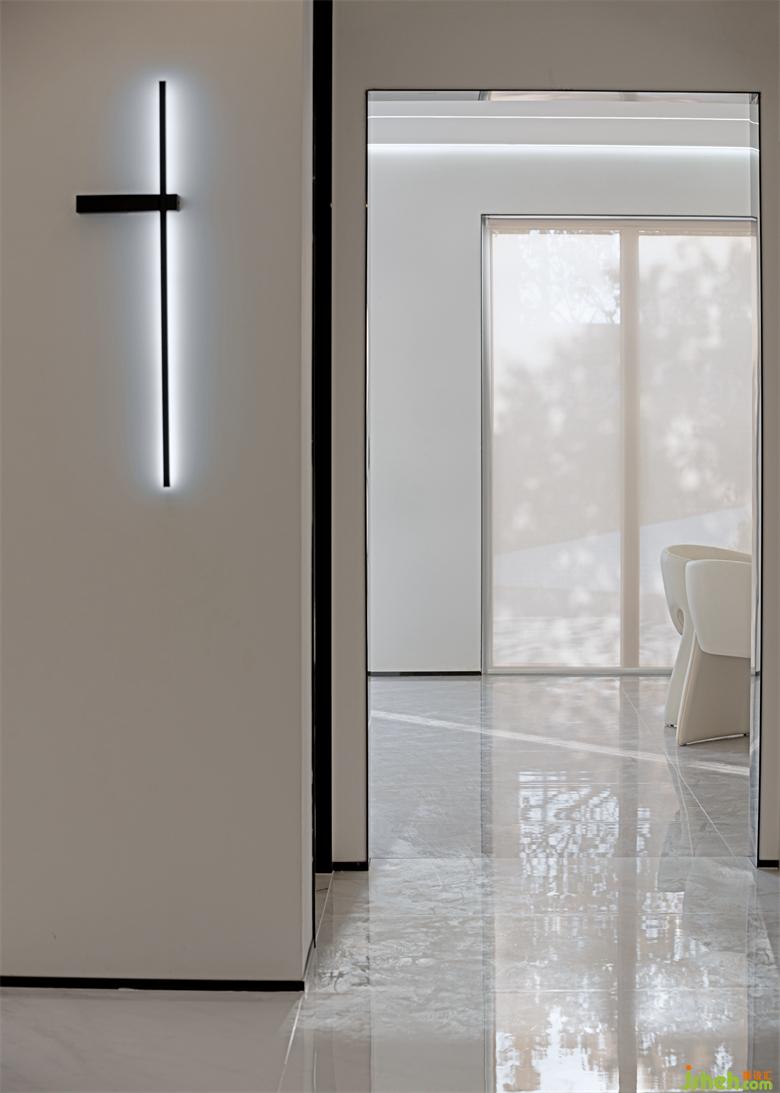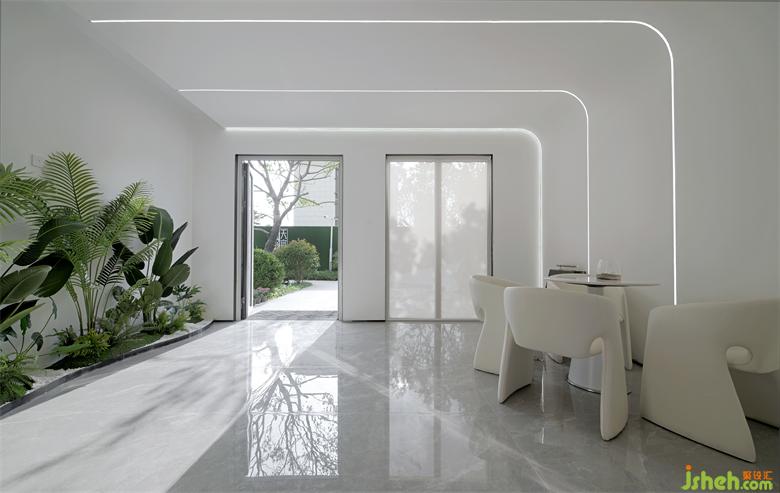 步入品牌的時空連廊,通透開敞,卻又內(nèi)斂聚和。設(shè)置在大面積白色背景的線性燈光將空間輪廓勾勒出來,與大面積的可視幕墻的光形成鮮明對比,營造出時空“隧道”中的光影場景。