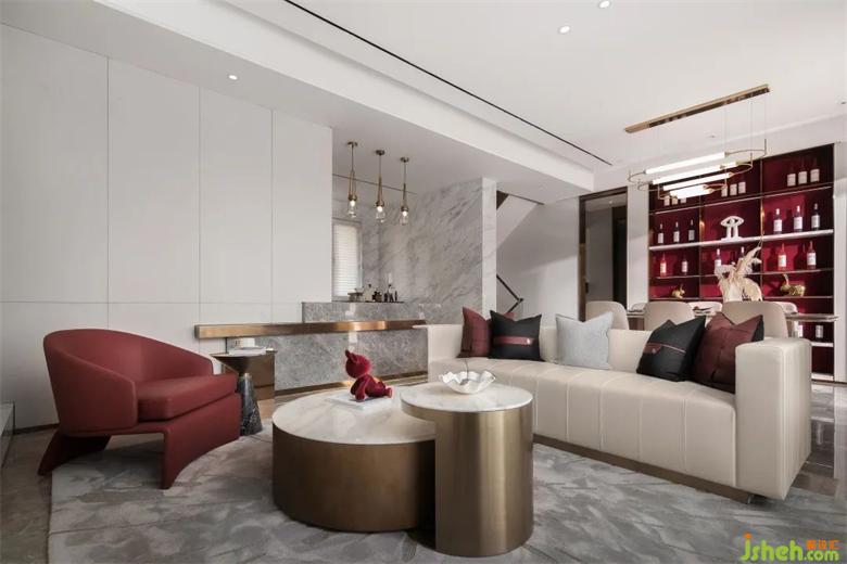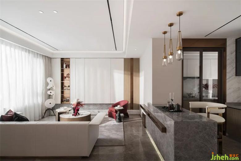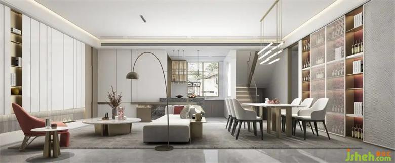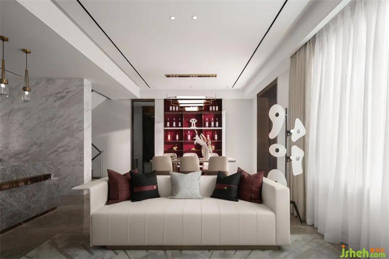 空間自上而下流暢一體,營造統(tǒng)一序列感,擴大空間視覺。樣板房設(shè)計燈火可親,家人閑座,塑造出更自然、舒適的用餐環(huán)境。餐邊柜主體顏色與空間整體色調(diào)匹配,在視覺上延續(xù)空間的氛圍感。